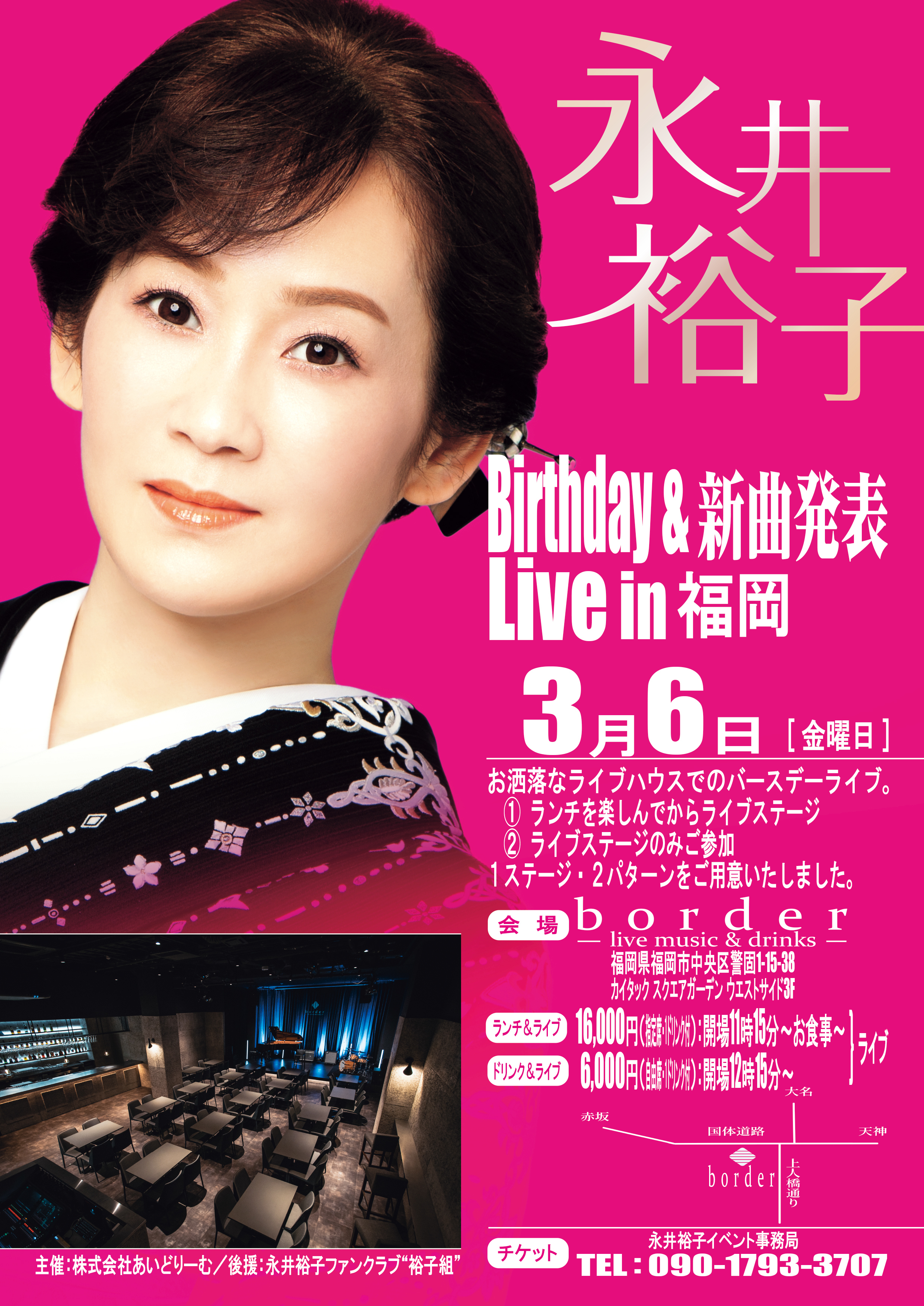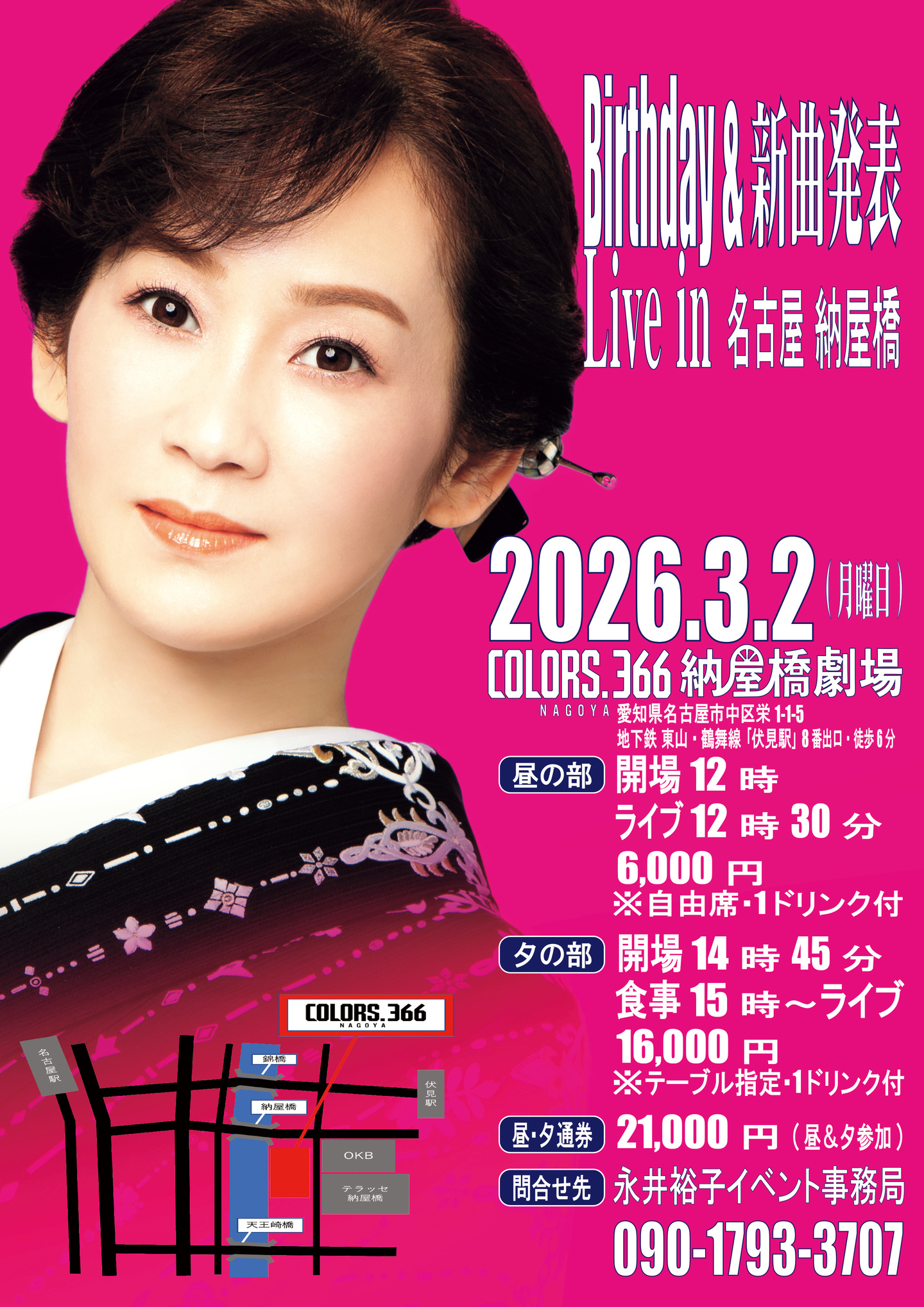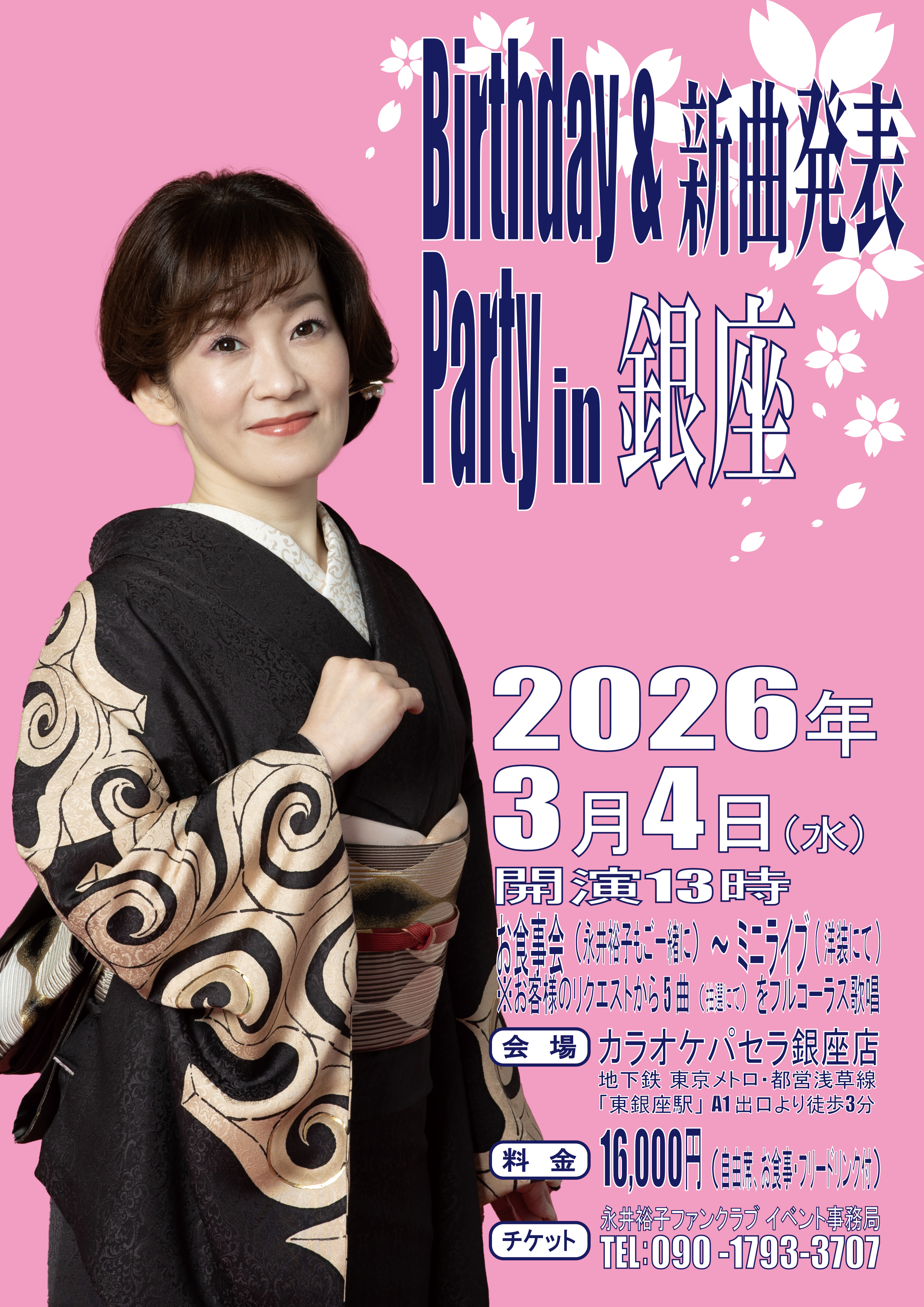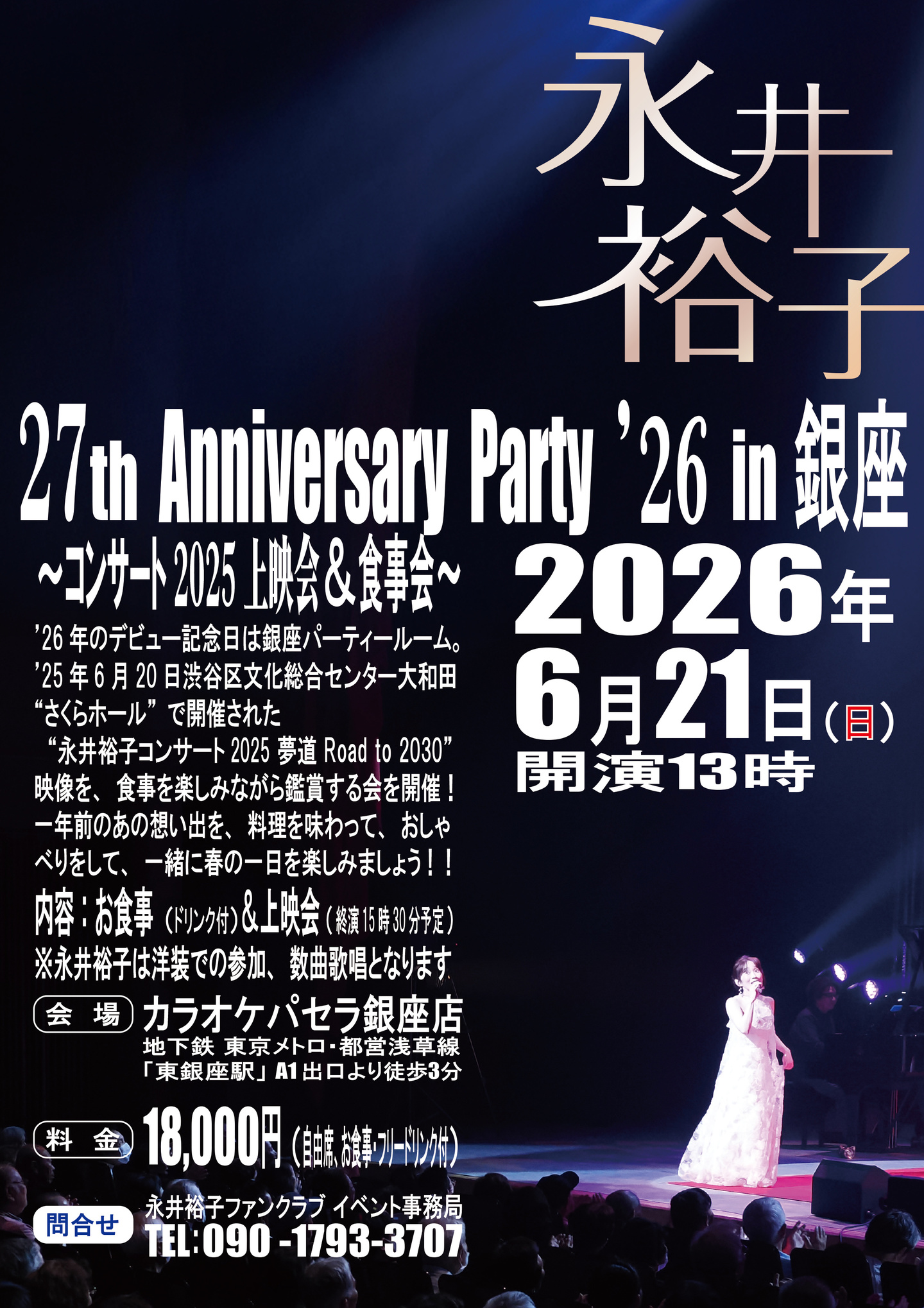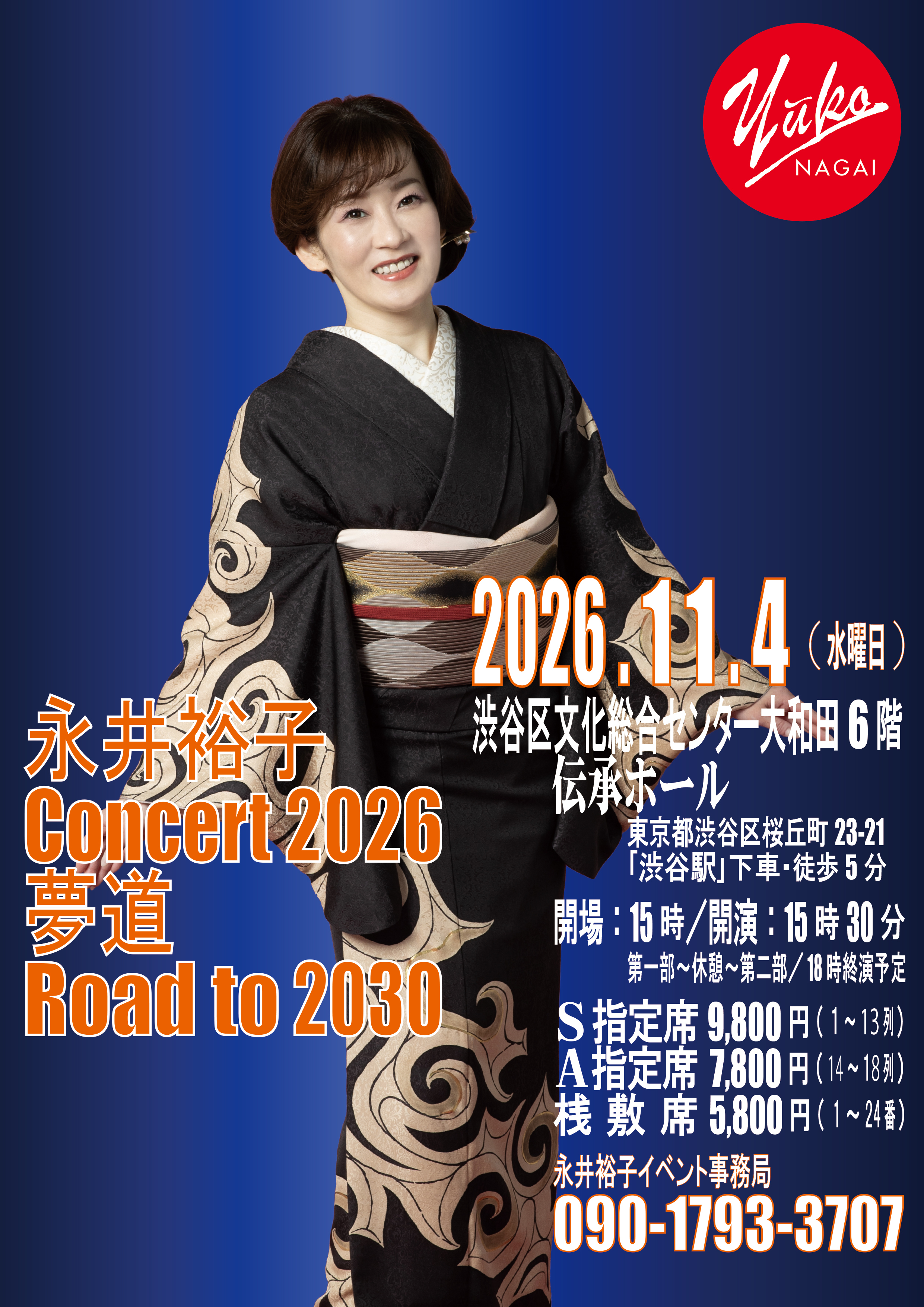 ネットショップ キングレコード ,,paging,{"site": "ameba", "blogid": "yukonagai0621", "max_results": "10", "link_words": "続きは永井裕子 Official Blog へ"} 【ココロウタは3分間のシネマです】 永井裕子がココロを込めて唄います。 ご視聴はこちら スケジュールカレンダー お客さまの「楽しさ」を大切にしています。 電話でのお申込みは事務局まで TEL:090-1793-3707 スケジュールカレンダーお客さまの「楽しさ」を大切にしています。 電話でのお申込みは事務局まで TEL:090-1793-3707 速報!! 永井裕子 Concert2026.11.4 (水)夢道 Road to 2030 イベント事務局へお問い合せ下さい Birthday Live 2026 2026.3.2 (月)in 名古屋・納屋橋 イベント事務局へ お電話下さい。 Birthday Party 2026 2026.3.4 (水)in 東京・銀座 イベント事務局へ お電話下さい。 Birthday Live 2026 2026.3.6 (金)in 福岡 イベント事務局へ お電話下さい。 クルーズランチ&ライブ 2026.3.29 (日)in 東京・お台場 イベント事務局へ お電話下さい。 Early Summer Live2026.5.11 (月)in 大阪・京橋 イベント事務局へ お電話下さい。 27th Anniversary Party2026.6.21 (日)in 銀座 イベント事務局へ お電話下さい。 キャンセルをご希望のお客様はこちら キャンセル規定 ネットショップ はこちら ネットショップはこちら 【キルト生地製 ティッシュケース】 ファンクラブ入会案内 ファンクラブご入会こちら 手作り紙芝居 お父さん手作り紙芝居はこちら お問い合わせ お問合せは お気軽に プライバリーポリシー 特定商取引法に基づく表示 サイトトップ プライバリーポリシー 特定商取引法に基づく表示 サイトトップ